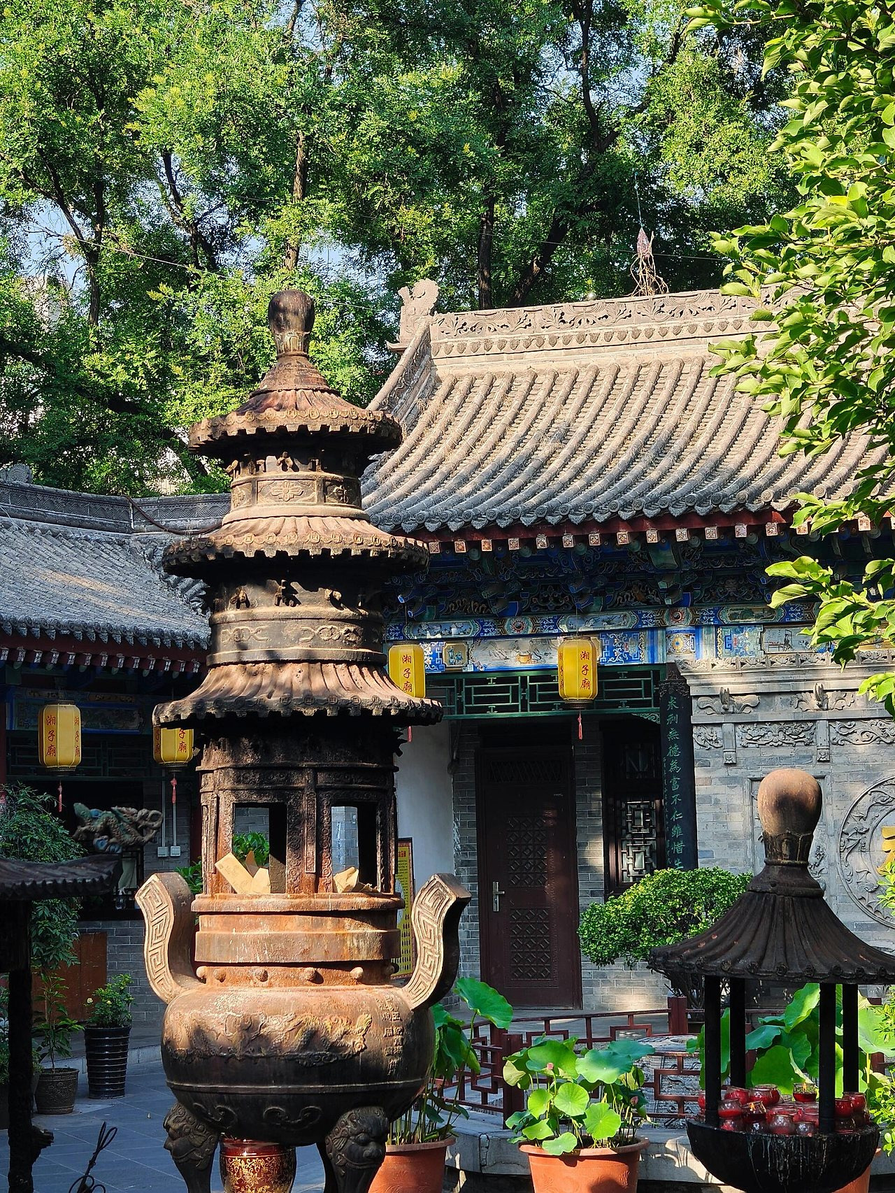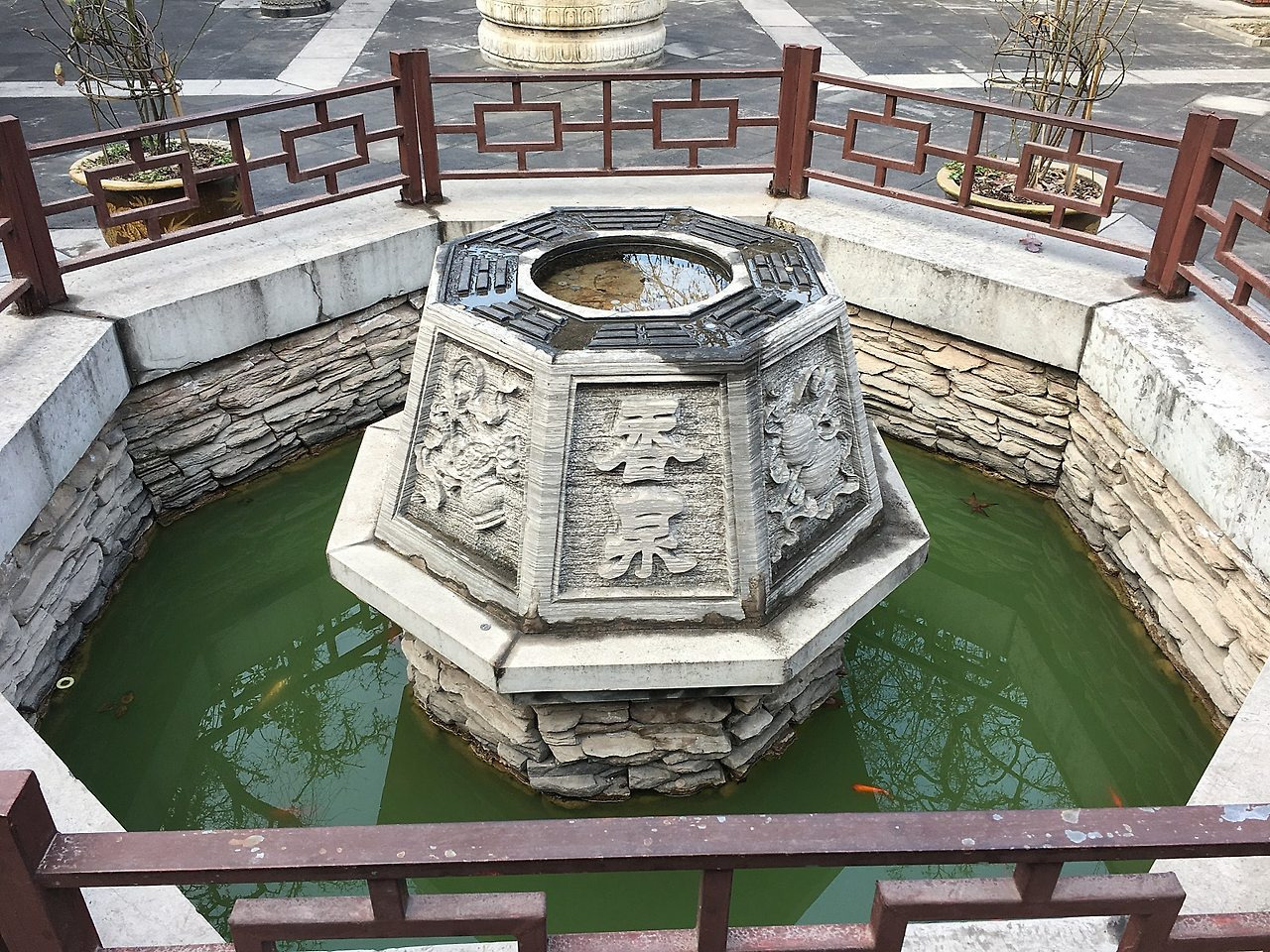 묘 내부의 배치는 간결하면서도 독특합니다. 우물 하나, 향로 하나, 제단 하나, 그리고 주전(主殿) 하나와 양옆의 편전(偏殿), 및 두 그루의 굵은 홰나무가 묘 전체의 주요 골격을 이룹니다. 우물은 전설이야기를 간직한 '향천(香泉)'으로, 외부 팔각형 입면에는 팔선의 법기(法器)가 조각되어 있고, 윗면에는 팔괘(八卦)가 새겨져 있습니다. 샘 안의 못은 원형이며, 못 바닥에 새겨진 음양어(阴阳鱼)는 윗면의 팔괘와 어우러져 하나의 완전한 입체 태극도(太极图)를 이룹니다.