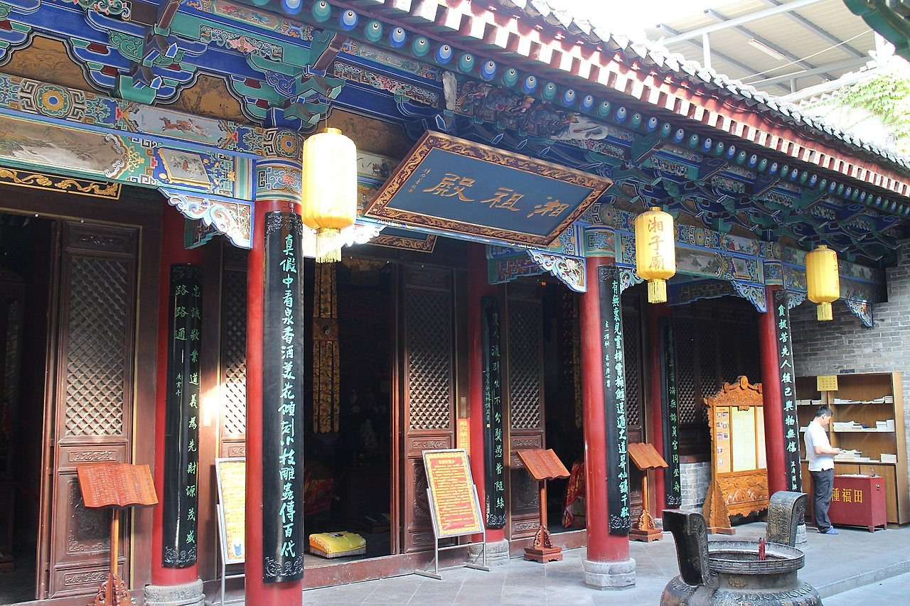영관전 앞에는 활짝 핀 연꽃 화분 몇개가 놓여 있어 순결하고 고아한 느낌을 줍니다. 전각 내부 중앙에는 왕영관(王灵官) 상이 모셔져 있고, 왼쪽에는 마왕야(马王爷) 상, 오른쪽에는 월로(月老) 상이 있습니다. 백발과 흰 수염을 한 월로는 인자하고 친근한 모습으로, 좋은 인연을 하루빨리 만나기를 기원하는 수많은 미혼 남녀들의 발길을 끌고 있습니다.