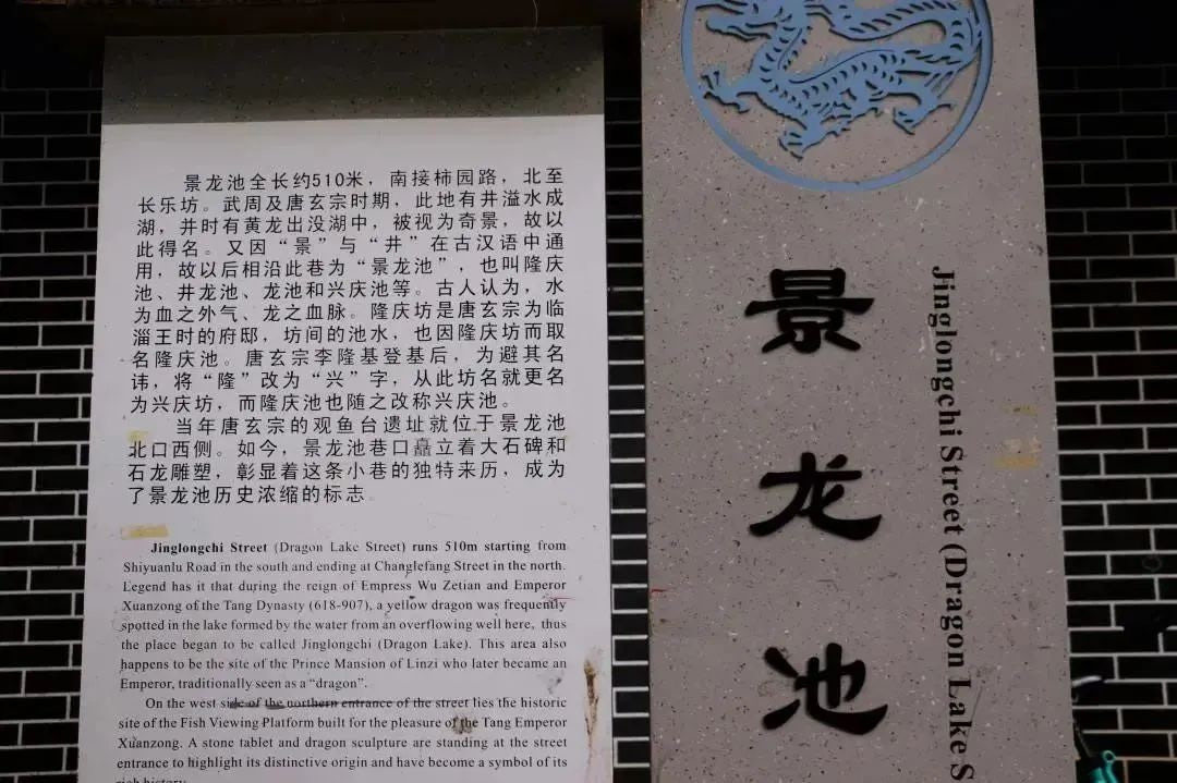당나라 경룡(景龙) 연간에 이곳은 9왕자의 저택이었으며, 현종 이융기(李隆基)가 어린시절을 보낸 곳입니다. 당시에 지하수가 솟아나와 호수를 이루었고, ‘경룡지’라는 이름을 얻게 되었습니다. 상전벽해의 변화로 옛 ‘용지(龙池)’는 비록 더 이상 존재하지 않지만, 수많은 재미있는 역사이야기들은 이곳에 사는 주민들의 입에서 전해가고 있습니다.