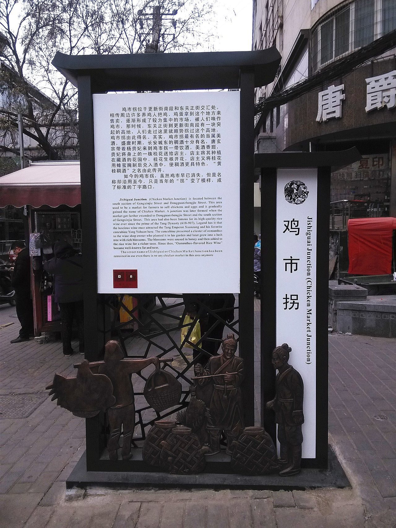 계시괴는 서안시 비림구(碑林区) 동관정가(东关正街)의 동쪽 끝에 위치합니다. <동관구사(东关旧事)>의 소개에 따르면, 명나라말기에서 청나라초기에 닭을 키우는 사람들이 이곳에 모여 닭을 팔면서 ‘계시(鸡市, 닭 시장)’가 형성되었습니다. ‘괴(拐)’라는 글자는 ‘계시’가 마침 동관정가에서 북쪽으로 꺾어지는 모퉁이에 자리 잡고 있었기 때문에, ‘계시괴’라는 이름이 생겨났다고 전해집니다.