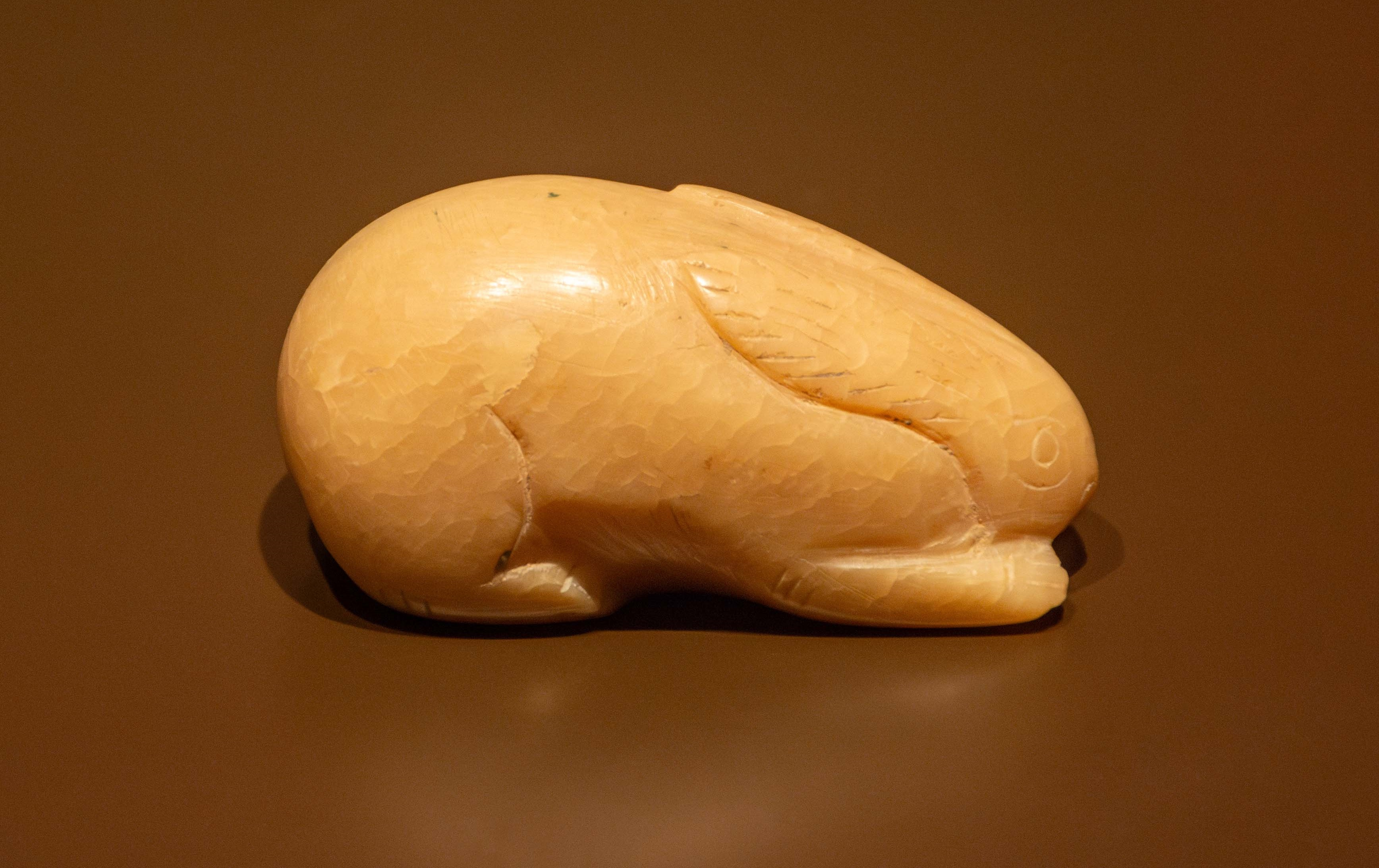 이 활석토끼는 보기 드문 당나라시대의 원조(圆雕)작품입니다. 원조는 옥기(玉器) 조각기법의 하나로, 입체조각 또는 원신 조각(圆身雕)이라고도 불리며, 모든 방향에서 감상할 수 있는 3차원 입체조각을 말합니다. 이 기법은 가공난이도가 높고 큰 부피의 재료가 필요하기 때문에 비교적 복잡한 예술형식에 속합니다. 따라서 역대 원각 옥기작품은 그리 많지 않습니다.