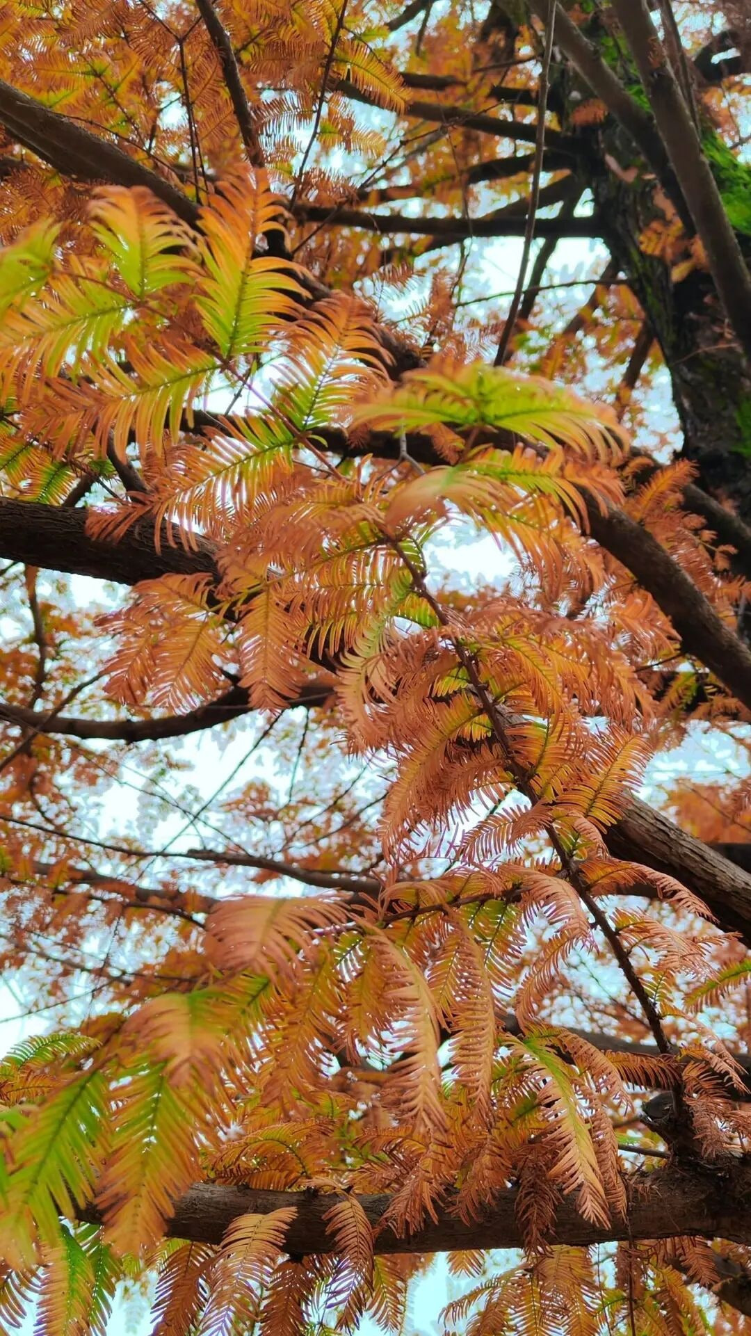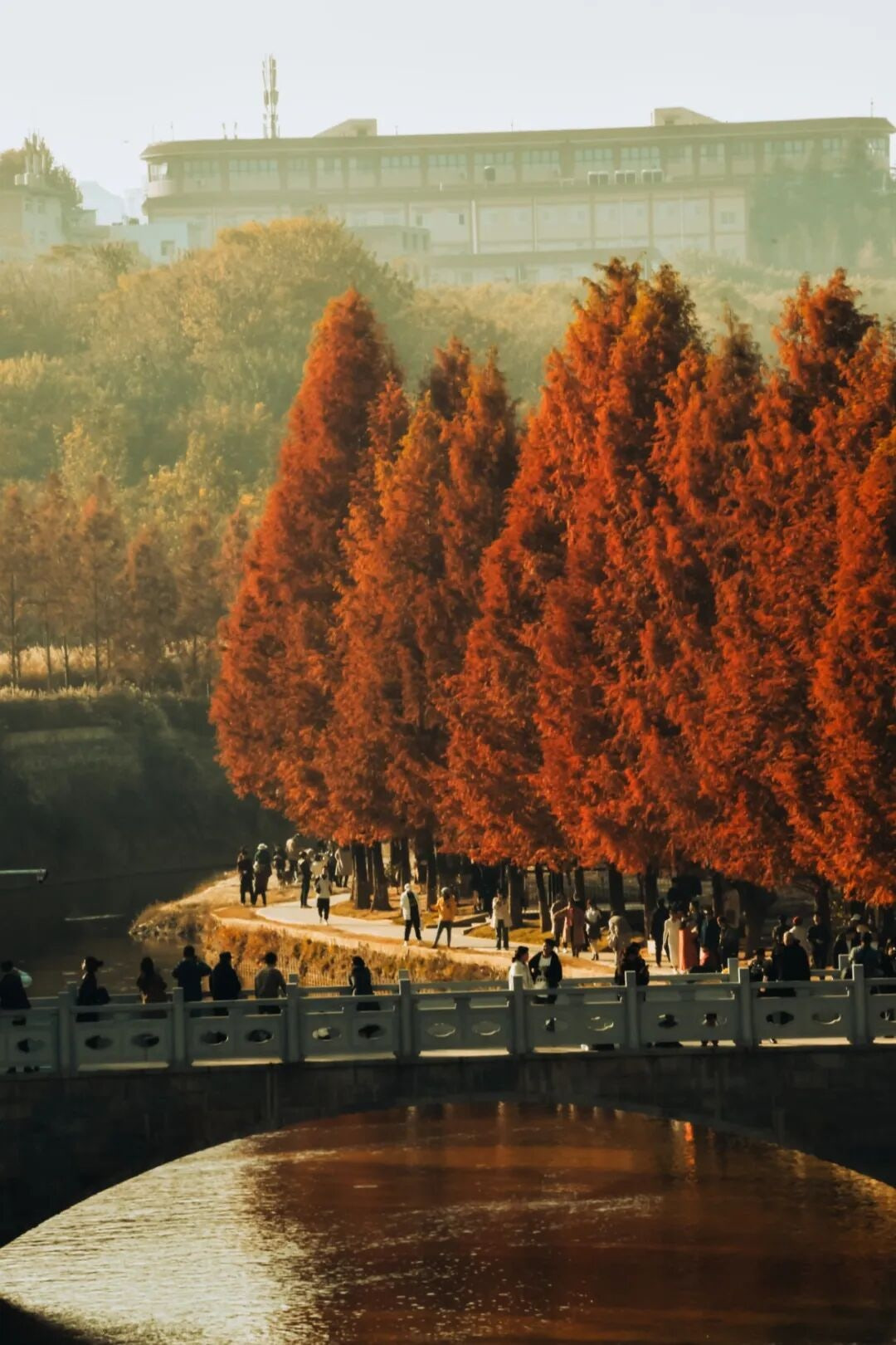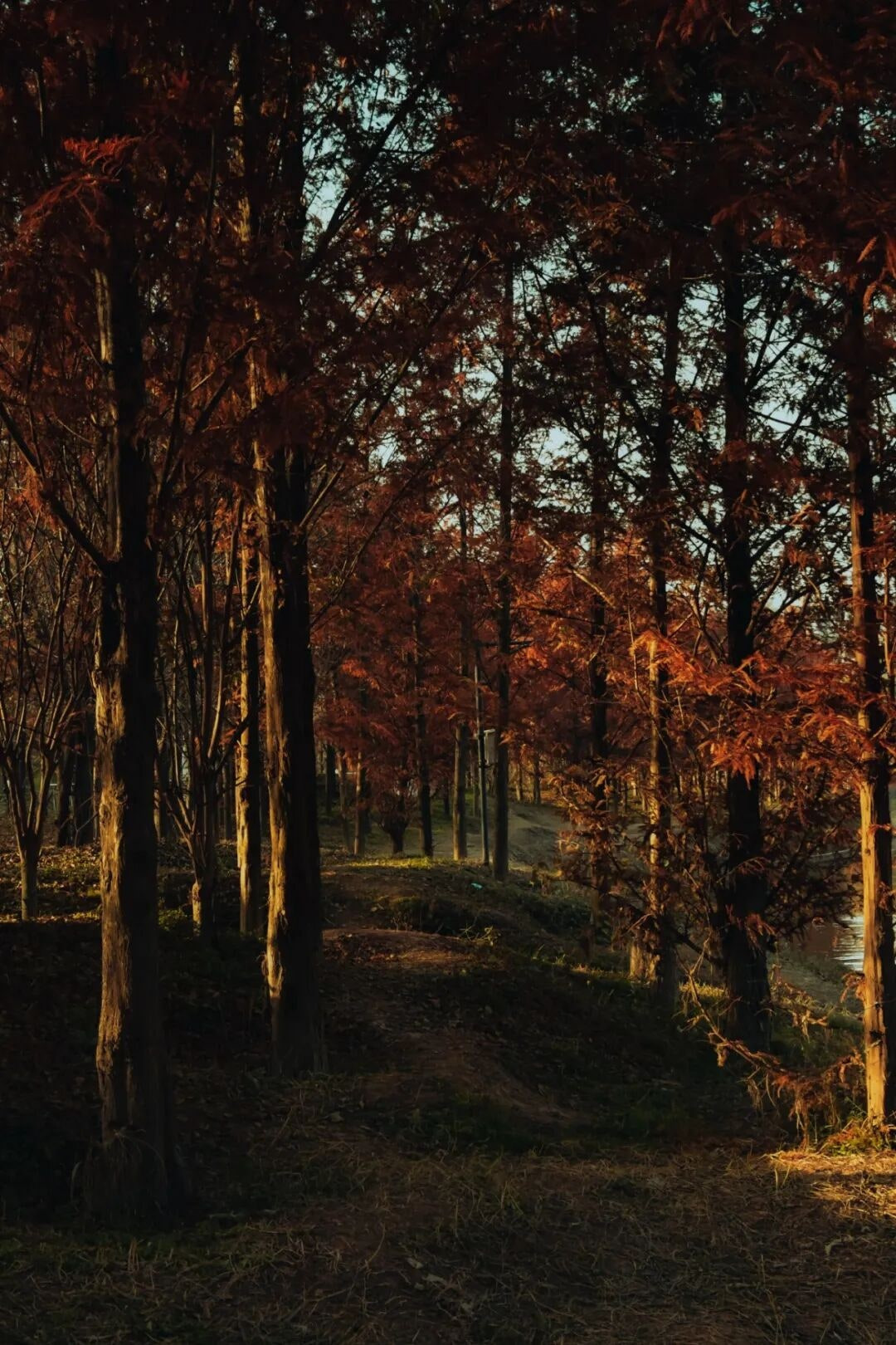 깊은 산속까지 가지 않아도 장안성 남쪽에서 화려한 단풍을 만날 수 있습니다. 매년 늦가을, 번천공원의 메타세쿼이아 숲은 타는 듯한 붉은빛으로 물들어 왕적(王绩)의 시 “나무마다 가을빛이 가득하네(树树皆秋色)”의 정취를 재현합니다. 율하(潏河)가 공원을 가로지르고 강 양편으로 메타세쿼이아 숲이 길게 뻗어 있습니다.