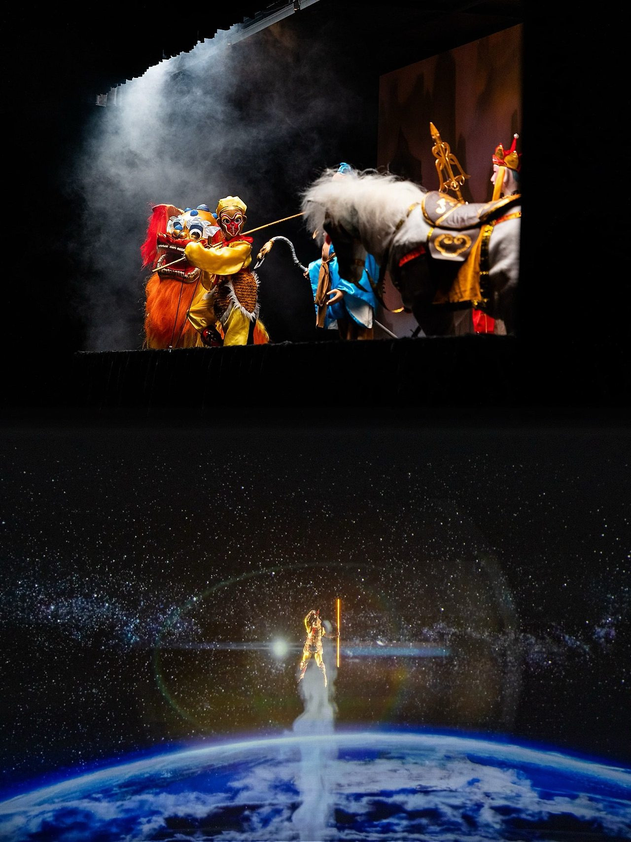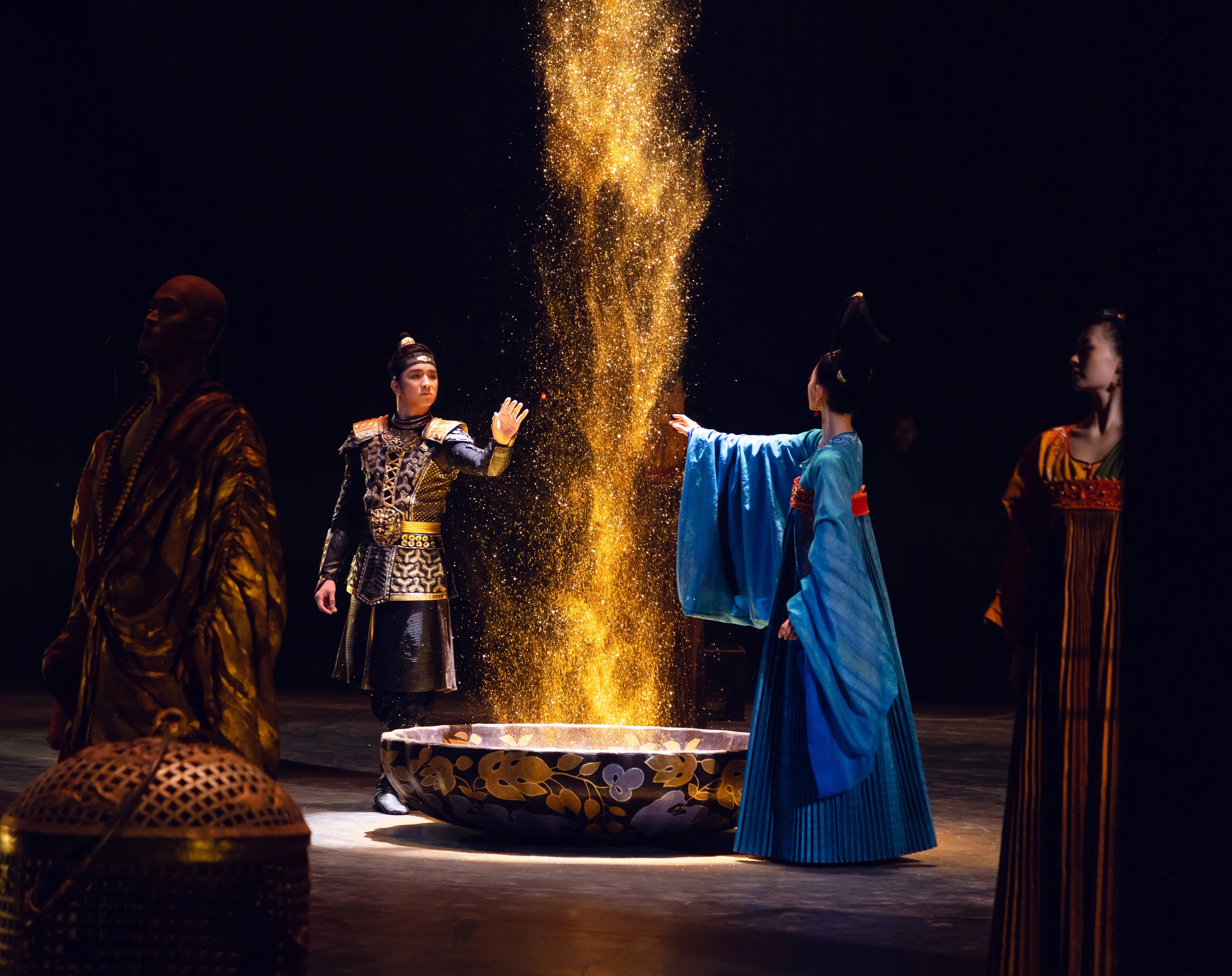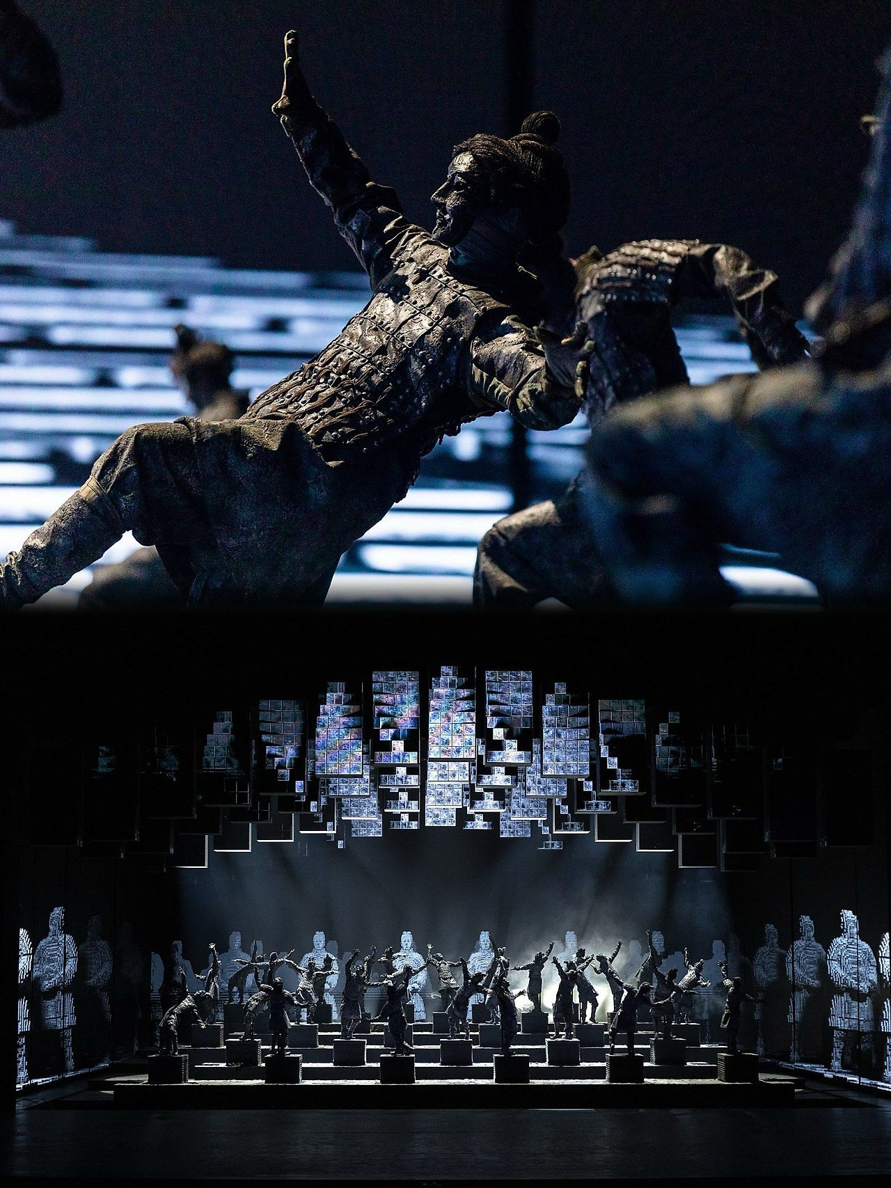 서주(西周) 시대에 기원한 중국 최고(最古)의 극종 중 하나인 국가급 무형문화유산 ‘진강(秦腔)’, 당나라 궁중에서 유행하며 성당(盛唐) 시기 음악과 무용의 정수를 보여주었던 ‘예상우의무(霓裳羽衣舞)’, 중국 그림자극의 원조라 불리는 ‘피영희(皮影戏)’와 강직하고 호방한 기운이 서린 ‘화음노강(华阴老腔)’, 민간 문화예술의 ‘살아있는 화석’으로 일컬어지는 ‘장두목우(杖头木偶, 지팡이 인형극)’, 탄수화물의 고장인 섬서성 사람들의 각별한 사랑을 받는 ‘면소(面塑, 밀가루 공예)’, 그리고 깊은 잠에서 깨어나 위용을 드러내는 ‘병마용(兵马俑)’ 등…. 이처럼 독특한 특색을 지닌 중국의 우수한 전통문화 요소들은 《무계·장안》을 통해 시공간의 경계를 넘어 현대적인 무대 디자인과 표현 기법으로 새롭고도 지속 가능한 생명력을 얻었습니다.