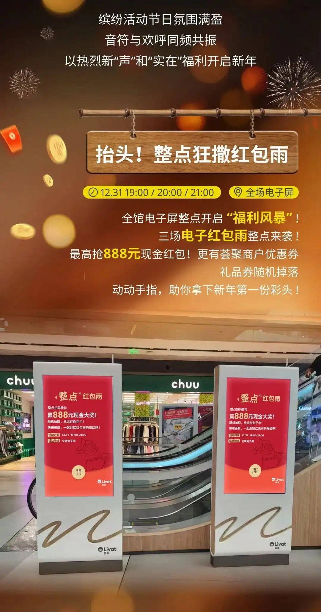 ‘설국기경’은 고도 서안에 바치는 하나의 시각적 시와 같습니다. 이 공간은 여백을 통해 방문객들로 하여금 자신의 내면을 들여다보고, ‘눈’이 상징하는 순수한 아름다움을 느끼도록 초대합니다. 이 행사의 절정은 연교차를 맞는 시기에 찾아옵니다. 12월 31일, ‘새해 소망 홍바오 비(红包雨: 행운의 붉은 봉투 비)’ 이벤트가 열릴 예정입니다. 쇼핑몰 내 모든 전자 화면이 놀라움과 축복의 물결이 되어, 행운과 경축을 상징하는 ‘홍바오’가 화려한 디지털 불꽃처럼 쏟아질 것입니다.