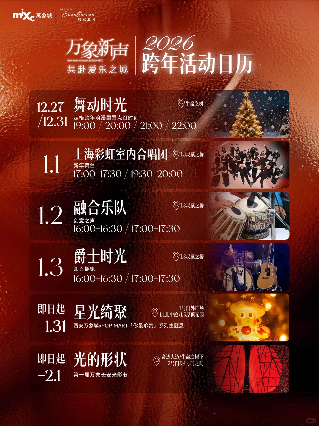 전시 외에도 ‘만상장안 빛과 그림자 축제(万象长安光影节)’를 놓치지 마세요. 📅 기간: 현재 ~ 2월 1일. 경이로운 빛의 예술 설치물들이 방문을 기다립니다. ‘기적의 거리(奇迹大道)’, ‘생명의 나무’, 만상성 3번 및 4번 게이트 근처의 포토 스팟을 추천합니다. 서안 완샹청에서는 이 외에도 다채로운 활동이 준비되어 있으니, ‘새해 일정표’를 확인하시어 알찬 방문 계획을 세우시기 바랍니다.