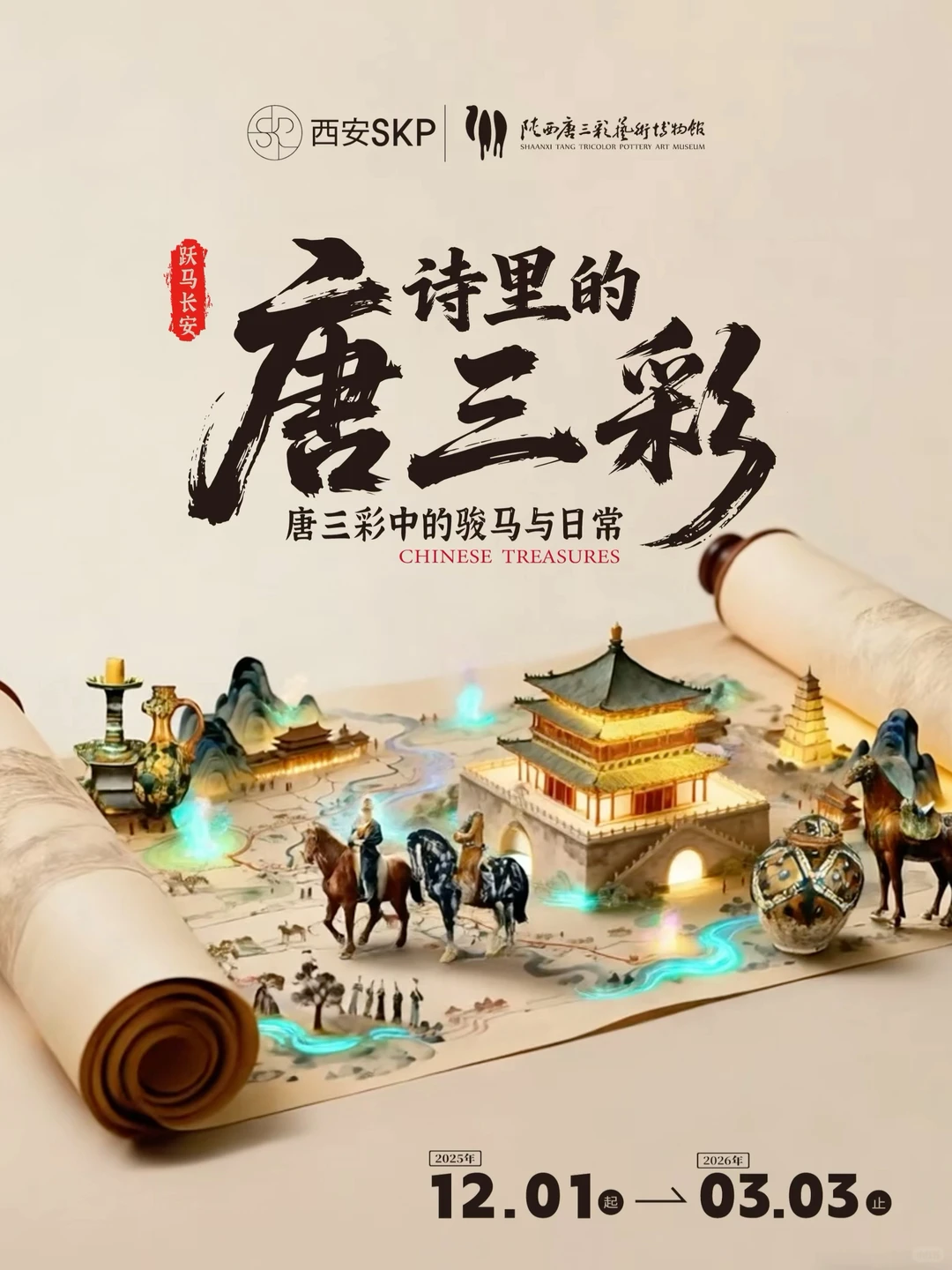 서안 SKP와 섬서성 당삼채 예술박물관(陕西唐三彩艺术博物馆)이 공동 기획한 문화재 예술 특별전 〈당시(唐詩) 속에 흐르는 삼채(三彩)〉가 공식 개막, 무료로 공개합니다. 2026년 3월까지 이어지는 이번 전시에서 시민과 관광객은 쇼핑의 즐거움을 느끼는 동시에 당나라 유물 중에서도 귀한 ‘명마(名馬)’를 가까이에서 감상하며 독특한 문화적 몰입을 경험할 수 있습니다.