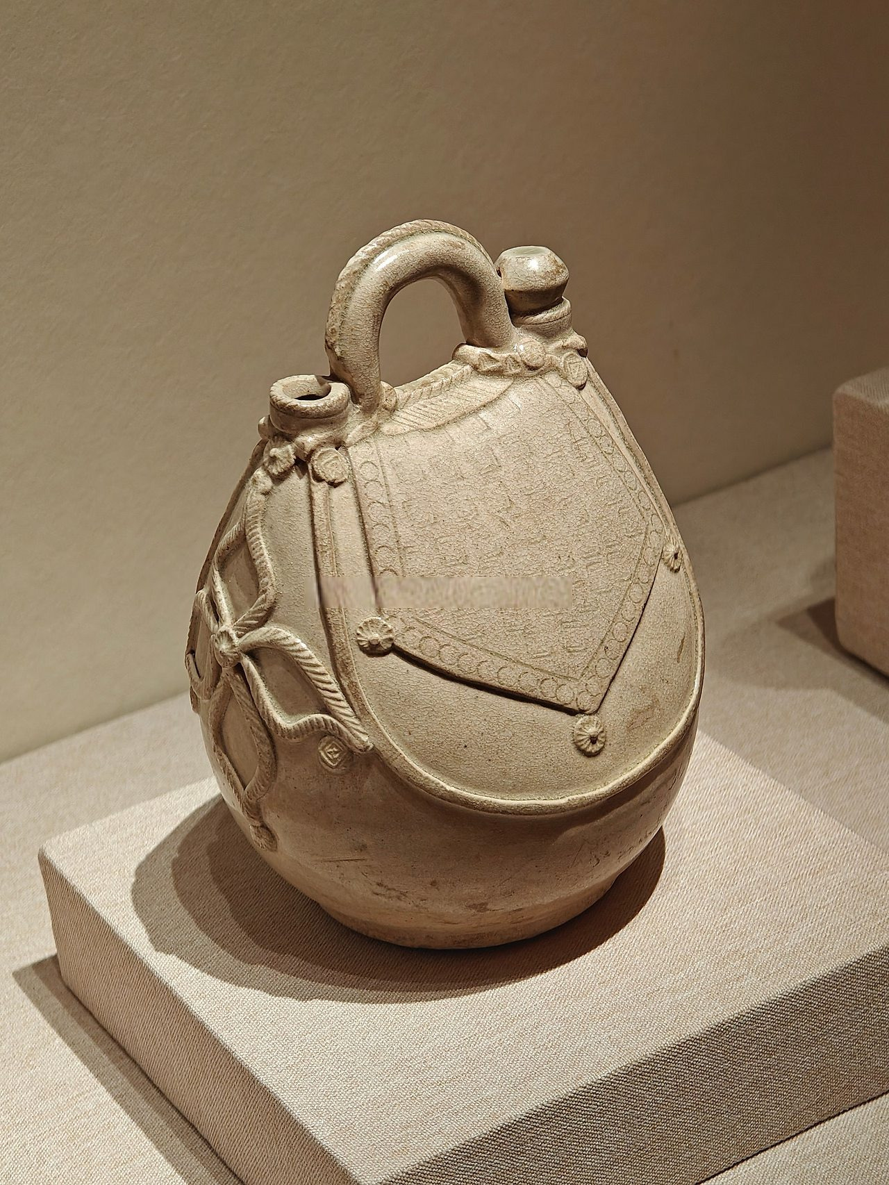도자기와 가죽 자루, 하나는 중국문화를 대표하는 기물(器物)이고, 다른 하나는 말등에서 삶을 영위하던 유목민의 전형적인 물건입니다. 이 둘이 시공을 초월하여 당나라 도예장인의 손길에서 하나로 승화되었고, 실크로드를 누비던 여행자들의 끊임없는 그리움을 세상에 보여주고 있습니다.