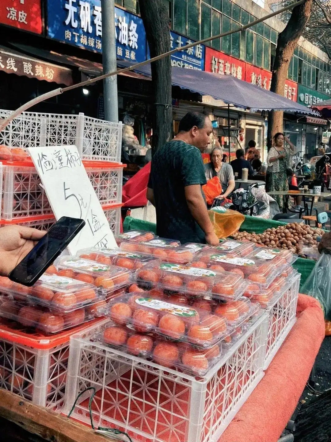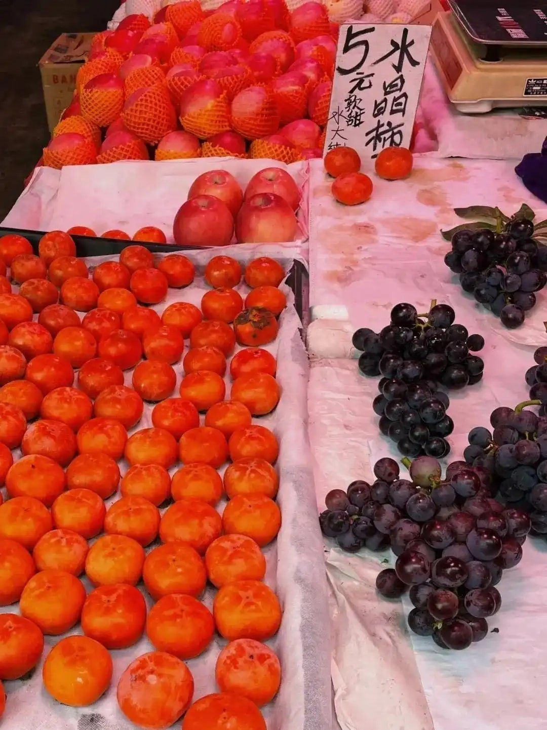 청경채가 가지런히 놓여 있고, 시금치는 붉은 뿌리를 달고 있습니다. 작은 산더미처럼 쌓인 토마토 껍질에는 윤기가 흐르고, 자색 포도에는 하얀 서리가 맺혀 있습니다. 멀리서도 훠징스즈(火晶柿子. 서안의 감)의 달콤한 향기가 느껴집니다.