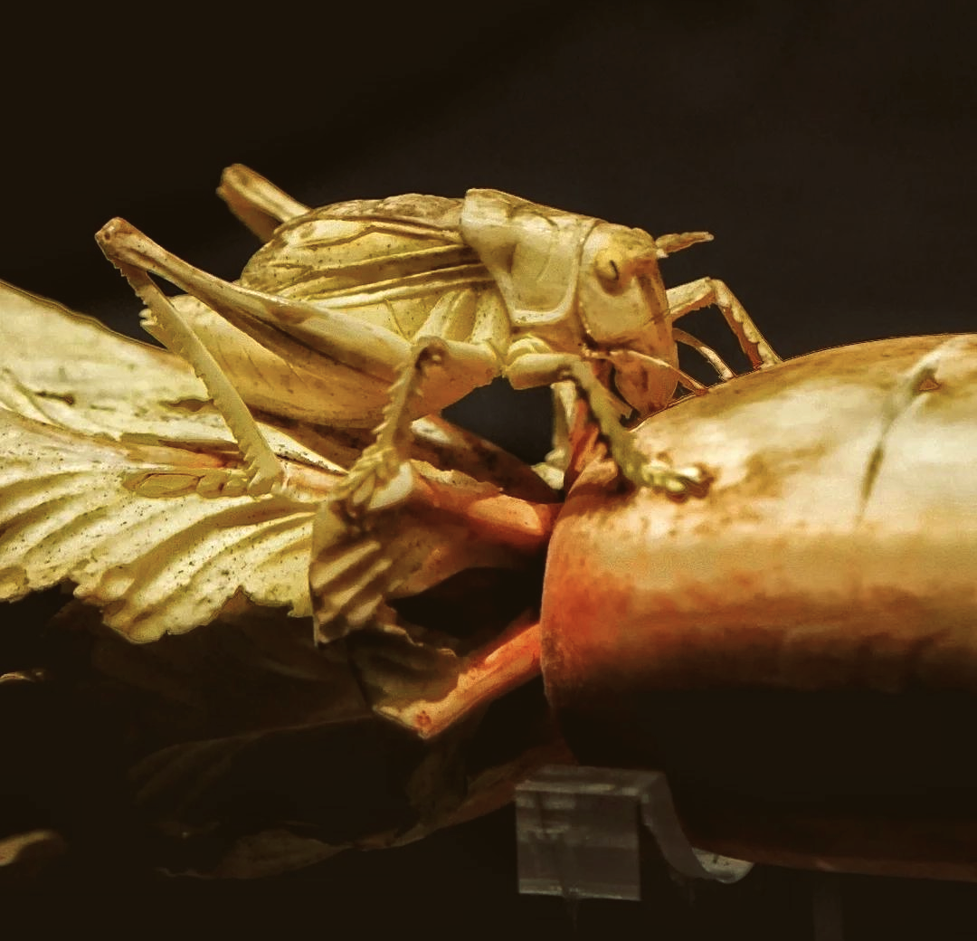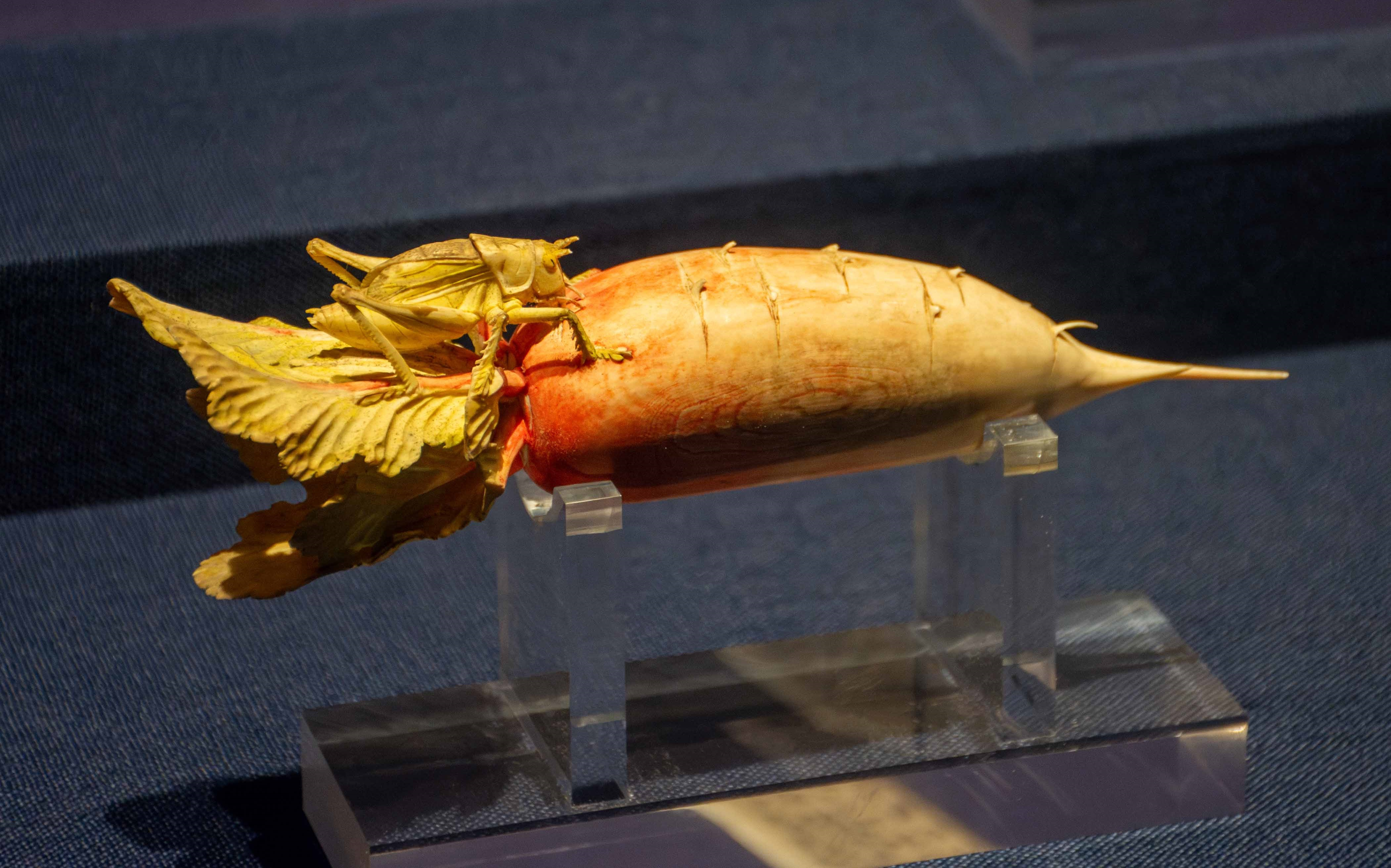 섬서역사박물관(陕西历史博物馆)에 소장된 상아 무우(象牙萝卜)는 상아를 통째로 다듬어 만들어졌으며, 길이는 20cm입니다. 무우 위에는 메뚜기 한 마리가 올라타 있어 마치 연한 줄기와 잎을 씹어 먹고 있는 듯하지만, 동시에 뜻밖의 습격을 받을까봐 두려워하는 것처럼 보입니다.